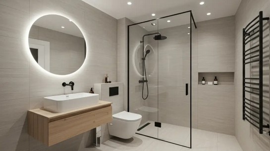 Os tons neutros são uma das escolhas mais consistentes em projetos de sala de banho moderna. Cores como bege, off-white, areia, cinza claro e variações de branco quente criam uma base visual serena, que favorece o relaxamento e amplia a sensação de espaço. Essa paleta funciona especialmente bem em ambientes pensados para desacelerar, onde o excesso de estímulos visuais é evitado.