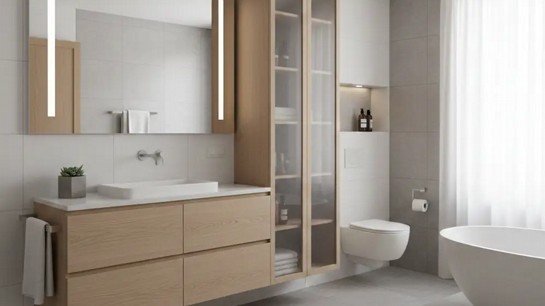 Essa organização não apenas facilita a rotina, mas também preserva a sofisticação do ambiente ao longo do tempo. O resultado é uma sala de banho prática, elegante e confortável, onde o design e a funcionalidade caminham juntos de forma natural.