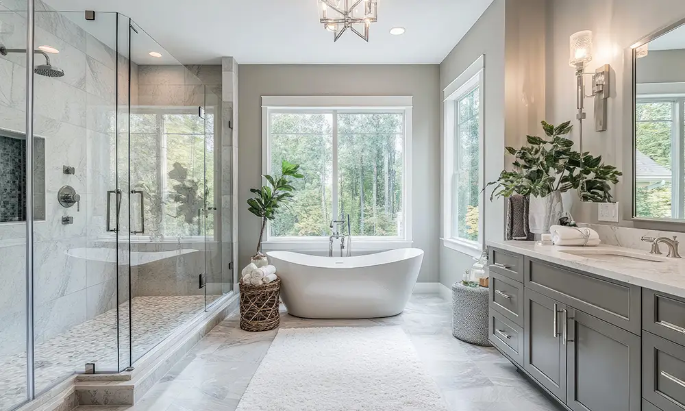 Na sala de banho, é comum encontrar áreas bem definidas, como um espaço dedicado ao banho de chuveiro, outro reservado para a banheira, uma bancada confortável e áreas de apoio planejadas com foco no armazenamento de produtos de higiene e beleza. Essa setorização melhora a experiência de uso e contribui para uma estética mais sofisticada e organizada.