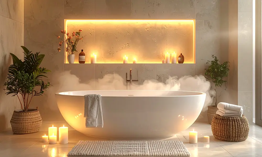 A sala de banho também pode estimular outros sentidos além da visão. Aromatizadores suaves e velas ajudam a construir uma atmosfera mais acolhedora e reforçam a ideia de spa em casa. O cuidado está na escolha das fragrâncias, que devem ser discretas e agradáveis, sem se tornarem dominantes.