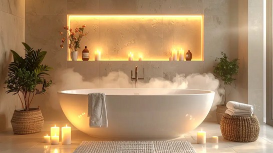 A ideia de ter um spa em casa está diretamente ligada ao conceito da sala de banho. Ambientes de spa são pensados para promover relaxamento físico e mental, e essa lógica é aplicada ao projeto residencial. A iluminação tende a ser mais suave, com uso de luz quente e pontos indiretos. Os materiais remetem à natureza, como madeira, pedra e superfícies com texturas sutis. O excesso de informação visual é evitado, criando um ambiente silencioso e acolhedor.