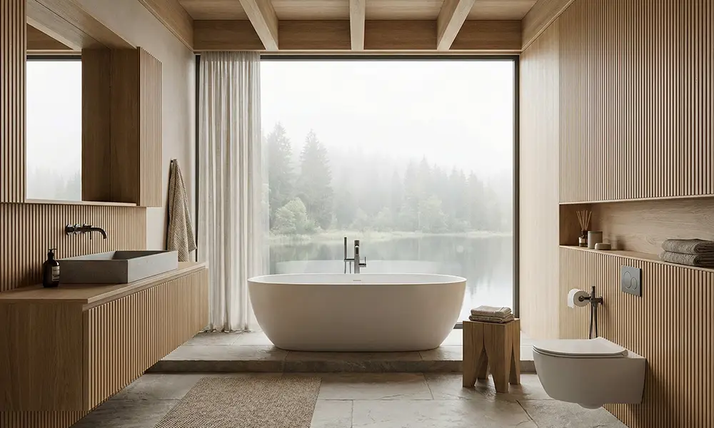 A presença de materiais naturais, especialmente a madeira, tem papel importante nesse contexto. Pesquisas em neuroarquitetura mostram que superfícies que remetem à natureza ajudam a ativar áreas do cérebro associadas à sensação de segurança e bem-estar. Quando aplicada em móveis planejados, painéis ou detalhes construtivos adequados para áreas úmidas, a madeira contribui para um ambiente mais quente e confortável.