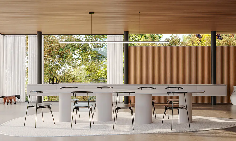 Na sala de jantar, os tampos orgânicos ajudam a construir composições mais dinâmicas dentro do ambiente. Mesas com formatos ovalados, circulares ou suavemente irregulares introduzem movimento na composição e estabelecem um contraste interessante com elementos arquitetônicos mais lineares, como painéis, marcenarias ou revestimentos.