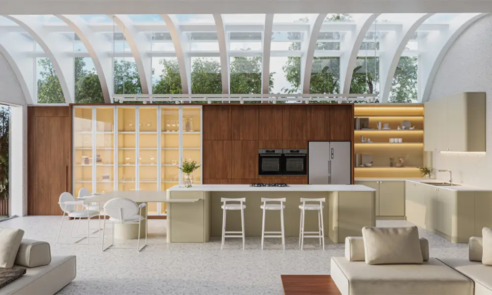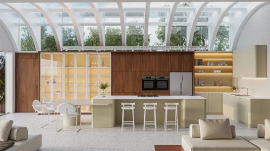A cozinha é um dos ambientes em que as curvas podem produzir um impacto significativo dentro do projeto. Em vez de trabalhar com uma ilha retangular tradicional, a introdução de uma ilha curva permite criar um volume central mais fluido, capaz de dialogar melhor com a circulação e com a organização do ambiente.