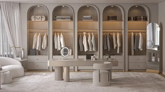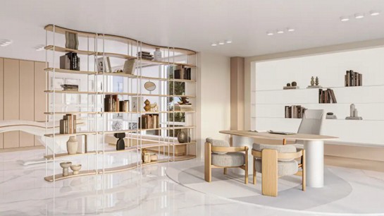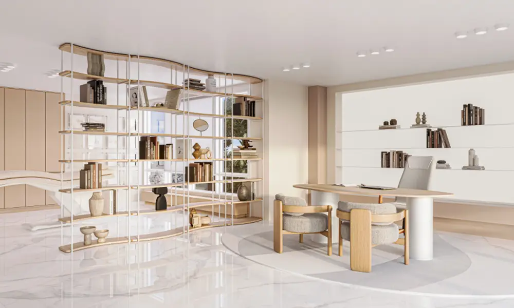 Esse efeito se torna particularmente relevante em projetos de interiores que buscam uma leitura espacial mais dinâmica. Ao combinar linhas ortogonais com superfícies curvas, o ambiente ganha contraste formal e maior riqueza visual. As curvas ajudam a suavizar a presença de volumes mais rígidos e introduzem movimento na composição, criando um equilíbrio interessante entre estrutura e fluidez.